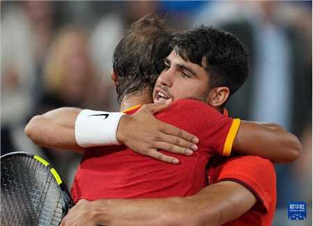 7月27日,阿尔卡拉斯(右)/纳达尔在赛后拥抱。新华社记者 万象 摄