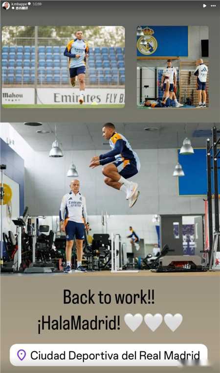 姆巴佩已经回到了皇马参加训练,他在社交媒体上晒出了自己训练的照片,并配文:“回来工作了!¡hala madrid!”