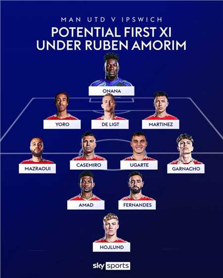 在阿莫里姆正式接手曼联之后,天空体育预测了这位葡萄牙教头执教首战的首发名单,他们认为曼联在阿莫里姆麾下将会改打三中卫。