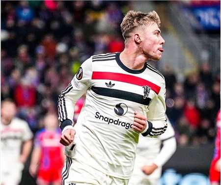 欧联杯联赛阶段第6轮,曼联客场2-1逆转击败比尔森胜利,霍伊伦替补登场上演梅开二度,至此,霍伊伦直接参与了曼联本赛季一半的欧联杯进球。
