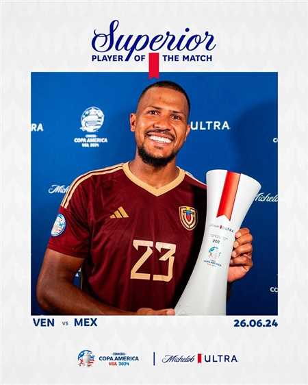 北京时间6月27日,美洲杯b组第二轮 较量,委内瑞拉1-0战胜墨西哥提前出线,本场比赛点射制胜的委内瑞拉前锋龙东当选比赛最佳球员。这是龙东连续两轮当选美洲杯单场最佳球员,此前对阵厄瓜多尔的比赛中龙东独造两球,赛后被评为比赛最佳球员。