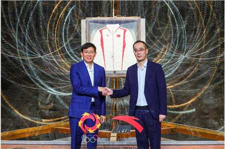 国家体育总局副局长周进强(左) 与安踏集团联席ceo赖世贤(右)进行巴黎奥运中国体育代表团领奖服交接仪式